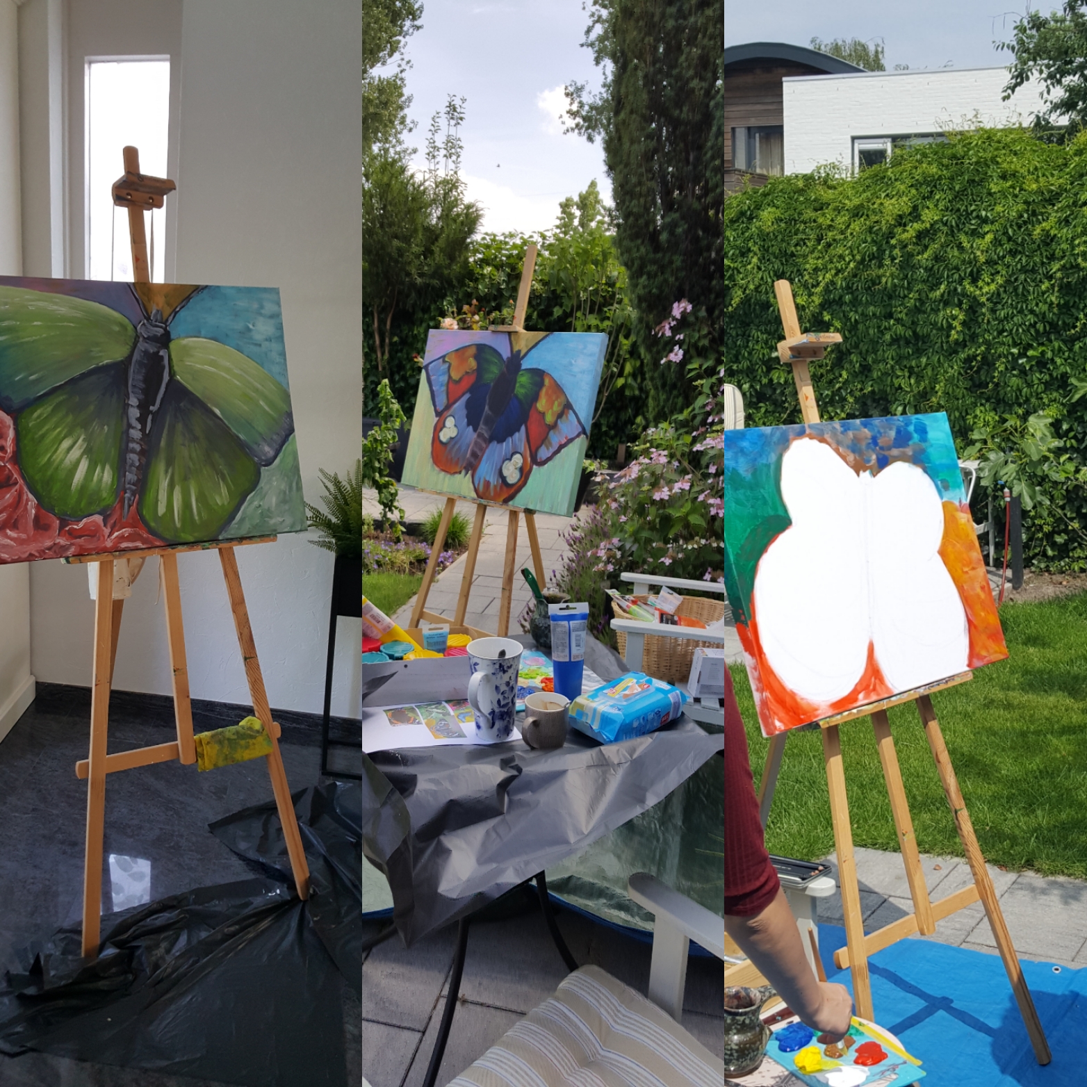 Mijn exemplaar lijkt mislukt… maar omdat ik niet van opgeven houd pak ik woensdag in alle rust mijn schilderspullen en probeer er nog iets van te maken. Al gauw ontdek ik dat de vleugels (boven groter dan onder) moet aanpassen. Ook print ik wat plaatjes uit, zodat ik mijn telefoon niet hoef te gebruiken. Al dat gesurf op internet onder de brandende zon is ook geen succes.
