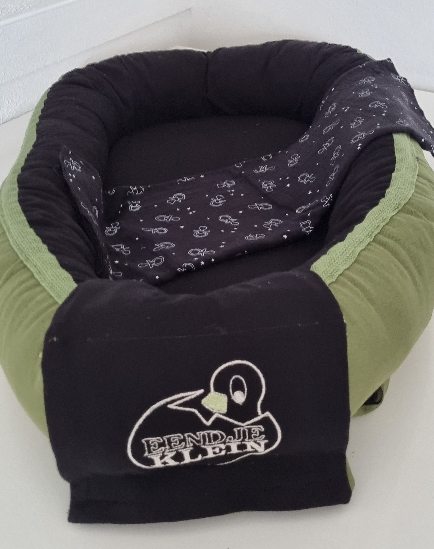 Prijs: €62,50 (incl. vulling en matrasje en luiertasje rond de uiteinden bij de voetjes. Het luiertasje kun je bevestigen aan het nestje. Het is voorzien van zwart hydrofiel spuuglakentje met speentjes print. Afmeting: 75 cm x 50 cm