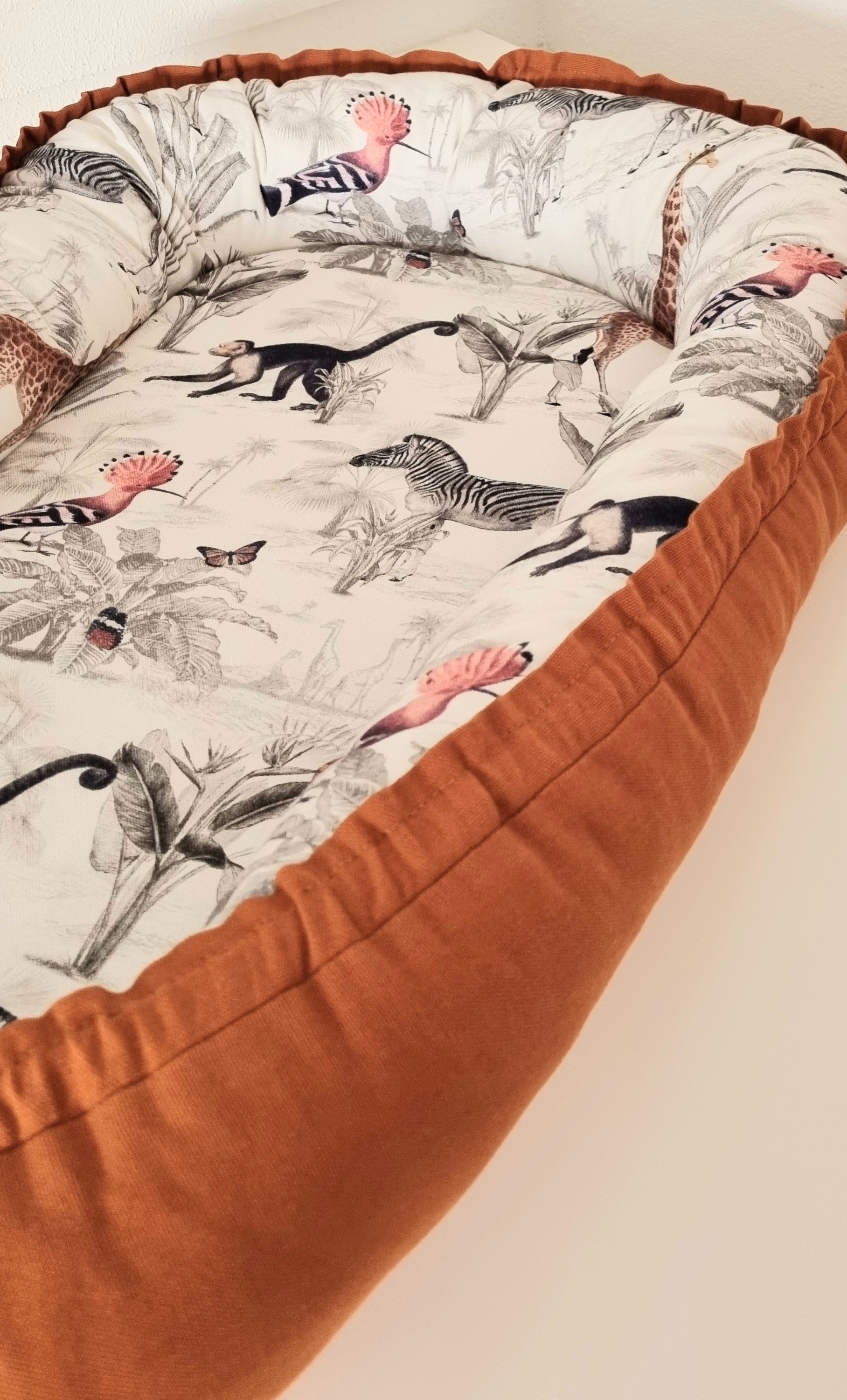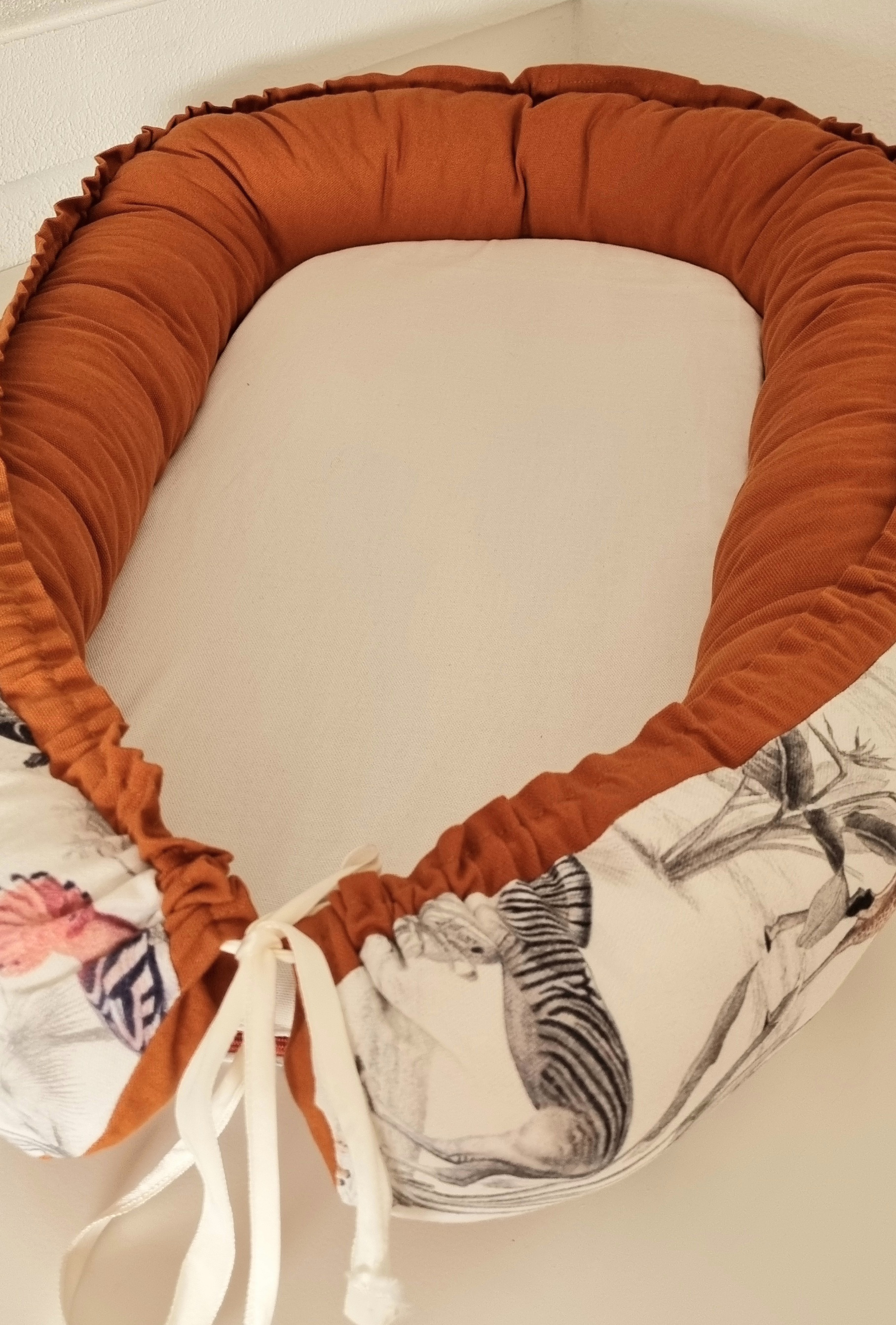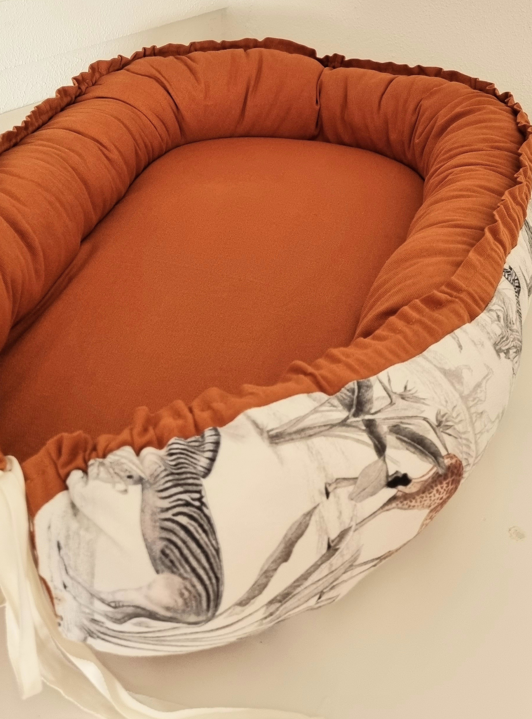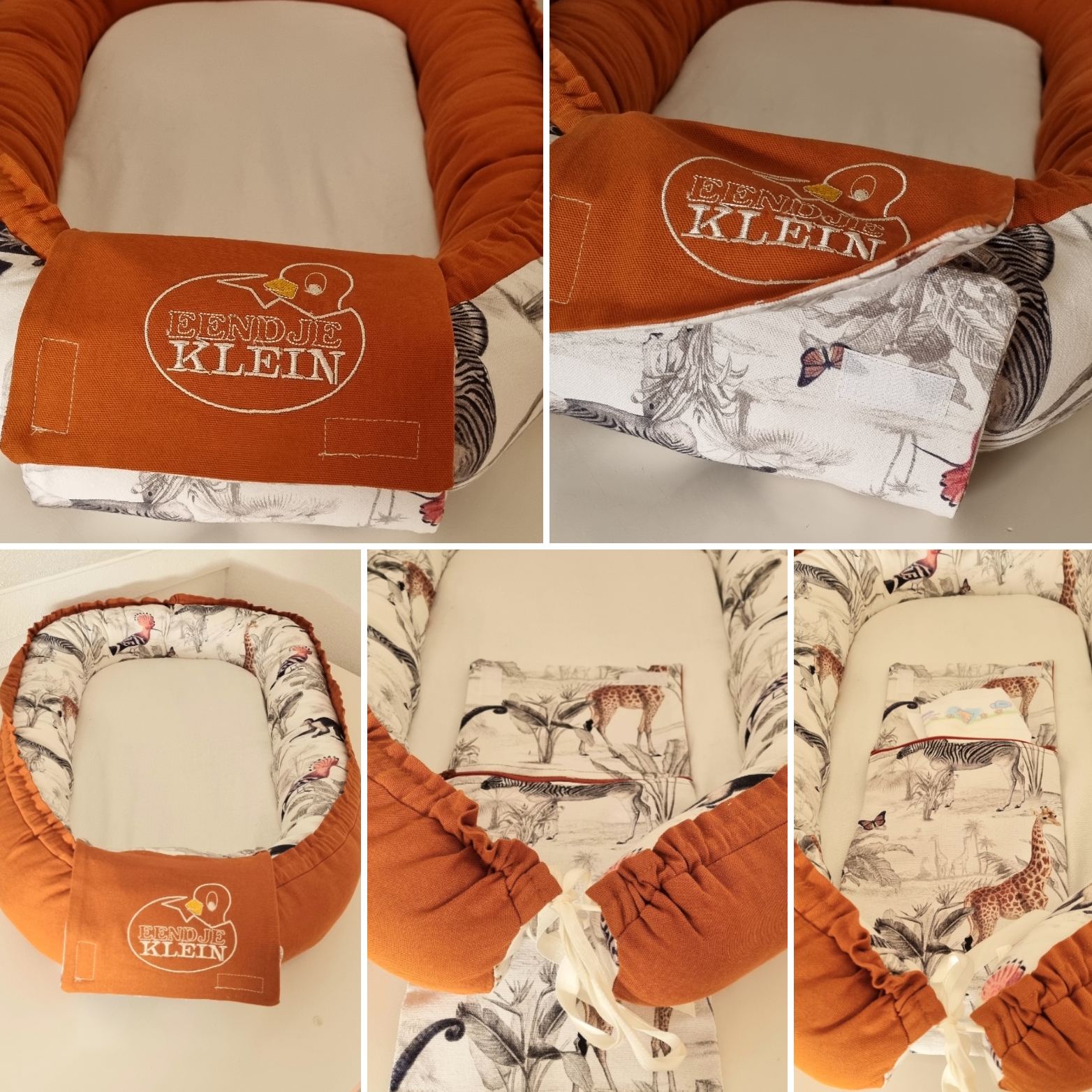 Exclusief uniek babynestje gemaakt op de naaimachine – aan twee zijden te gebruiken met leuke dierenprint / Afrikaprint.