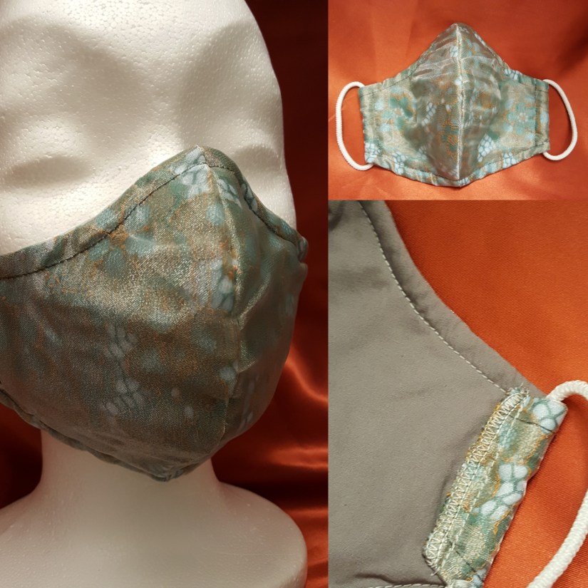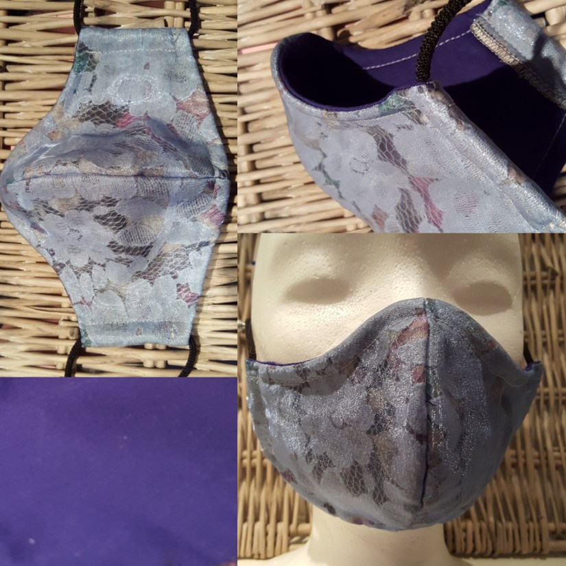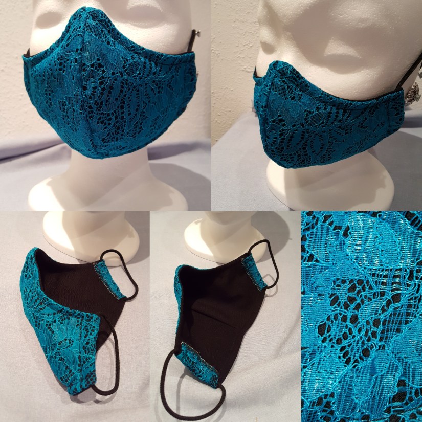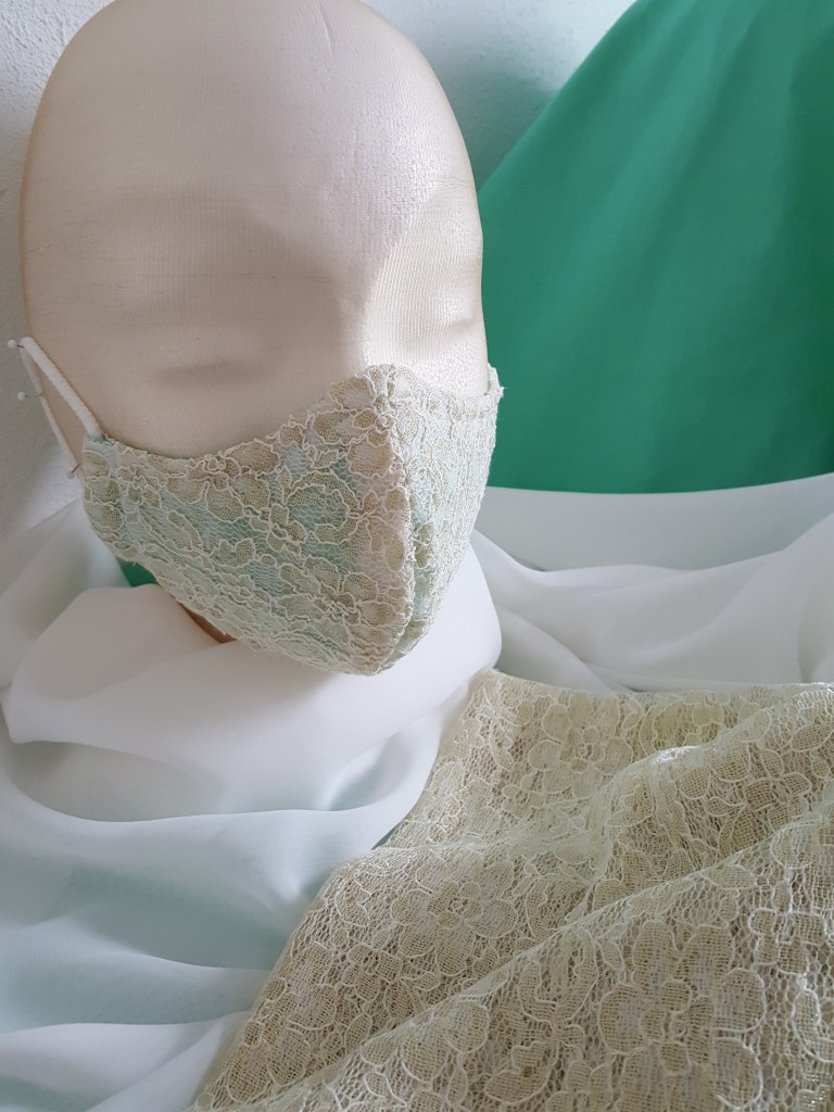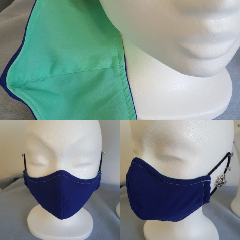 Blauw chiffon aan de buitenkant met mintgroene katoenen voering. Bestel dit mondkapje