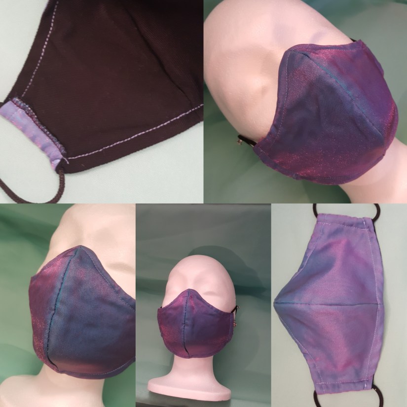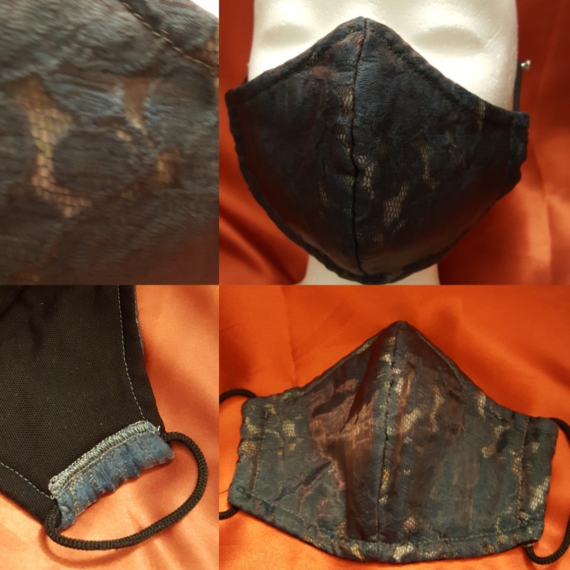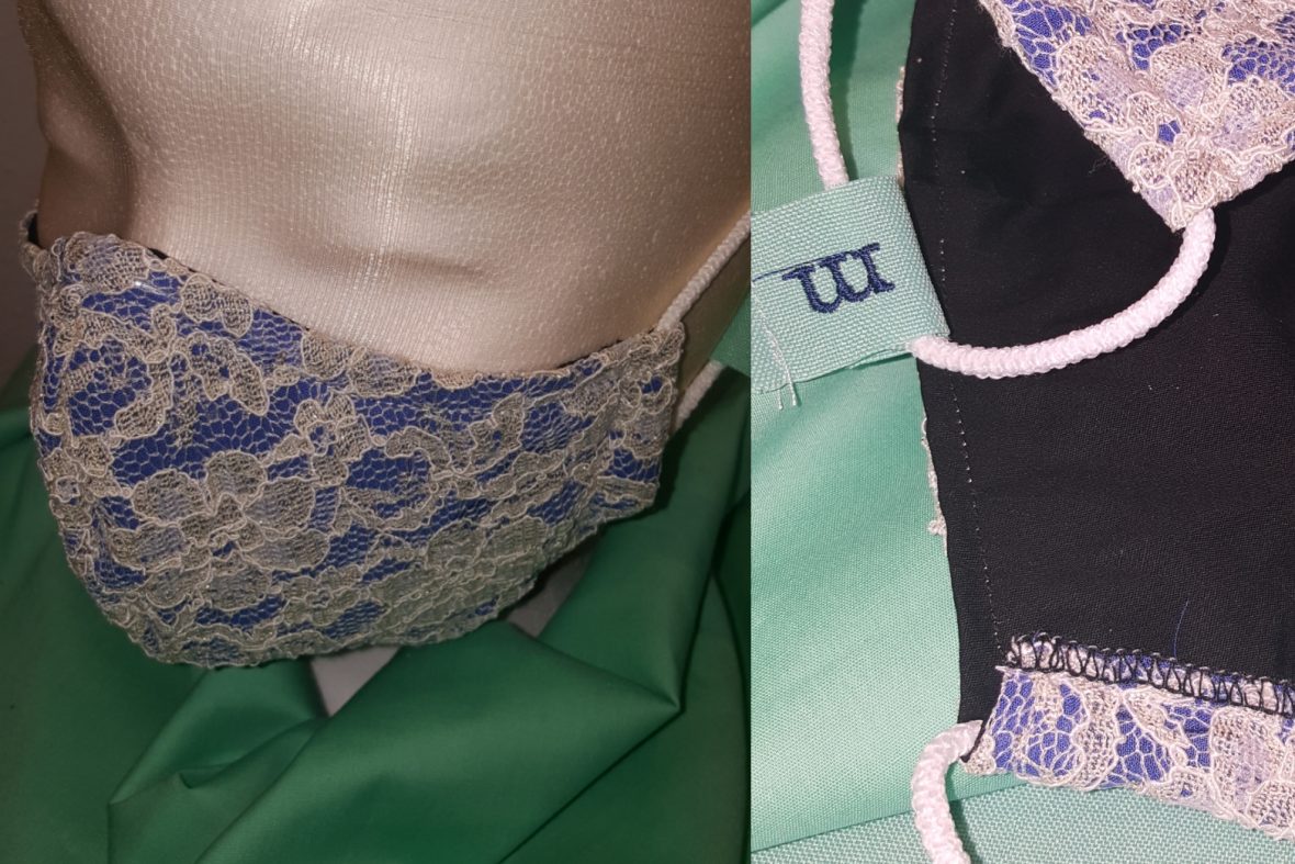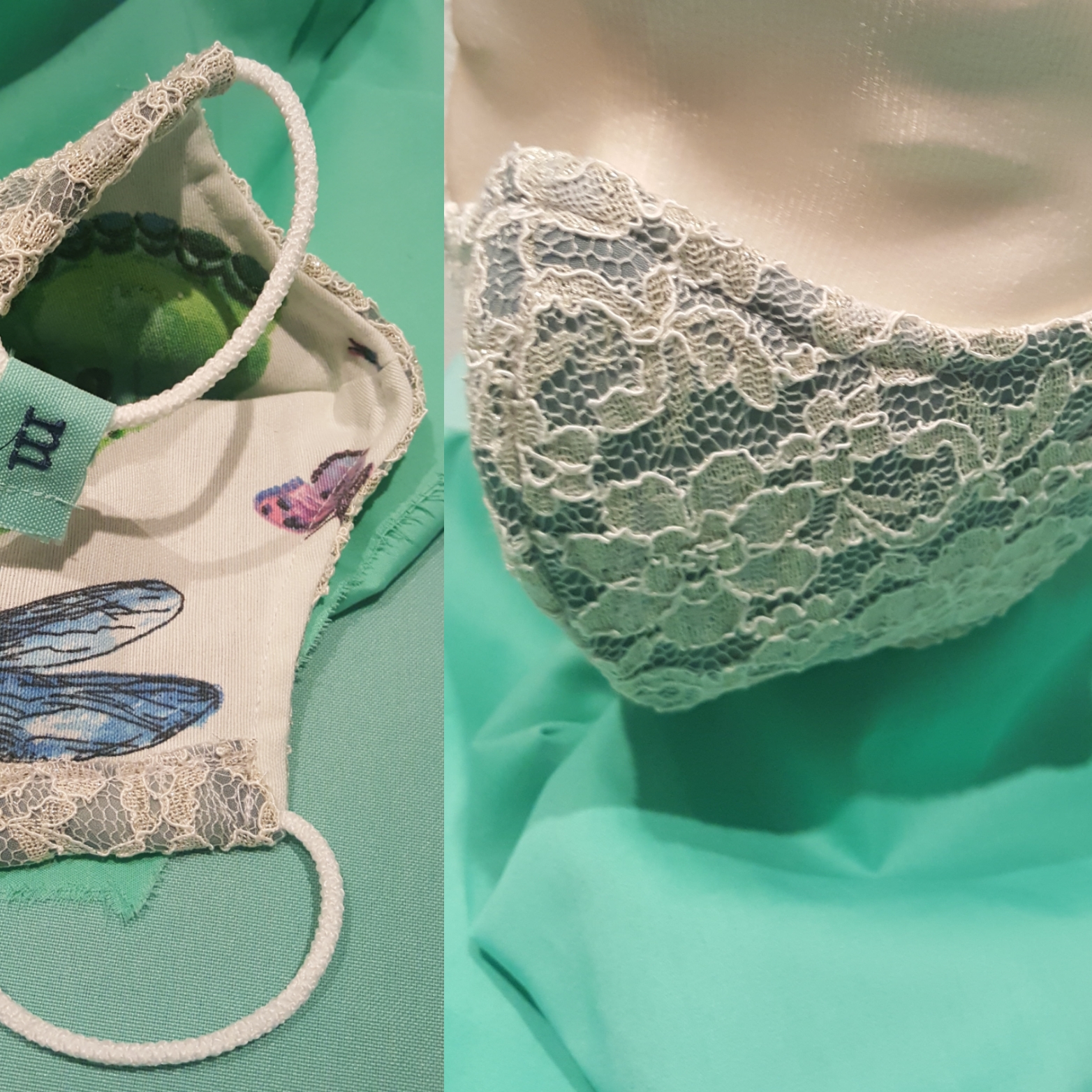 Blauw chiffon aan de buitenkant met mintgroene katoenen voering. Bestel dit mondkapje