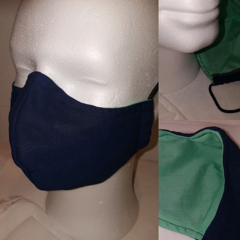 Buitenzijde donker marine blauwe dubbel laags chiffon. Binnenzijde mintgroen katoen. Doorgestikt met mintgroen garen.