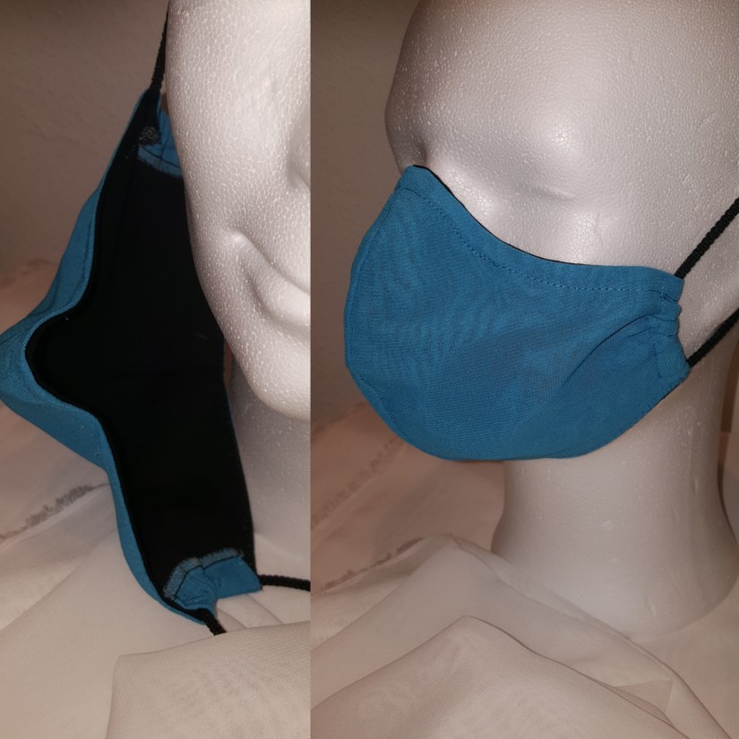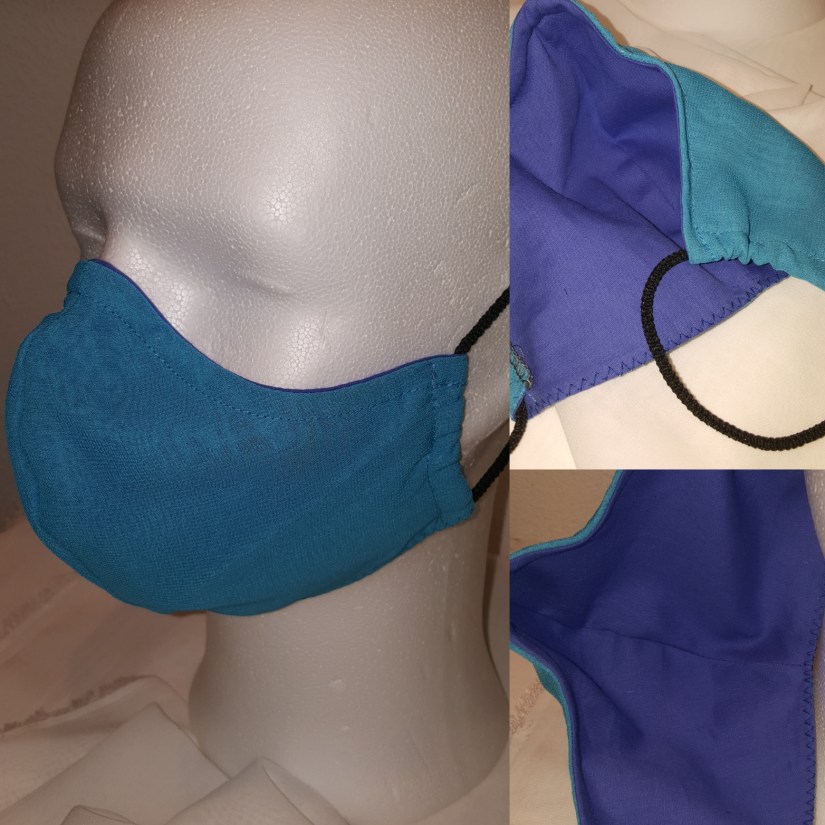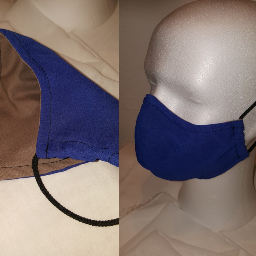 Blauwe buitenzijde van dubbel laags chiffon. Binnenzijde bruin-oranje katoen. Doorgestikt met zwart garen.