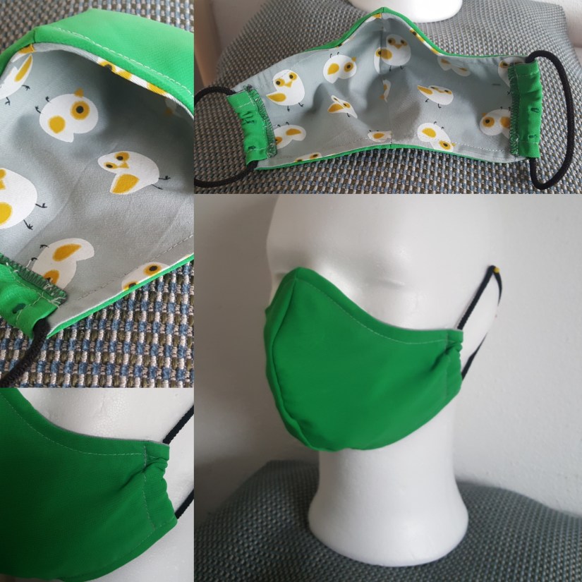 Buitenzijde dubbele laag gras-groene chiffon. Binnenzijde grijze katoenen voering met kuikentjes print.
