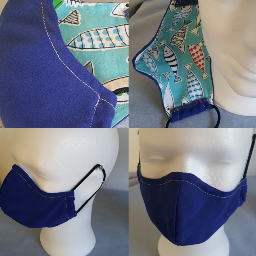 Buitenzijde dubbele laag blauwe chiffon met grijs stiksel. Binnenzijde lichtblauw katoen met vis print.