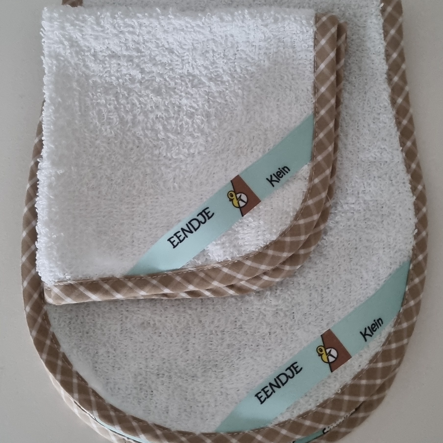 Het laatste babysetje is net gereinigd en gestreken en kan zo de verpakking in. Het setje bestaat uit een slabbetje, schouderspuugdoek en basic spuugdoekje. Ook dit setje is gemaakt van 100% katoen.
