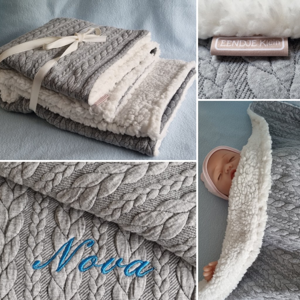 Nieuw in het assortiment; babydekentje van heerlijk zachte kabelstof gevoerd met witte Teddy. Leuk om te geven, maar ook om te krijgen!